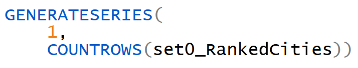 Im konkreten Beispiel soll über eine Integer-Liste iteriert werden. Die Integer-Liste soll die Liste der Rank-Values widerspiegeln. Beispielsweise enthält die Liste der Städte 8 Elemente, die entsprechend von 1 bis 8 gerankt sind. Daher soll das erste Argument für GENERATE eine Liste der Ganzzahlen von 1 bis 8 sein. Diese Liste wird mit GENERATESERIES erzeugt.