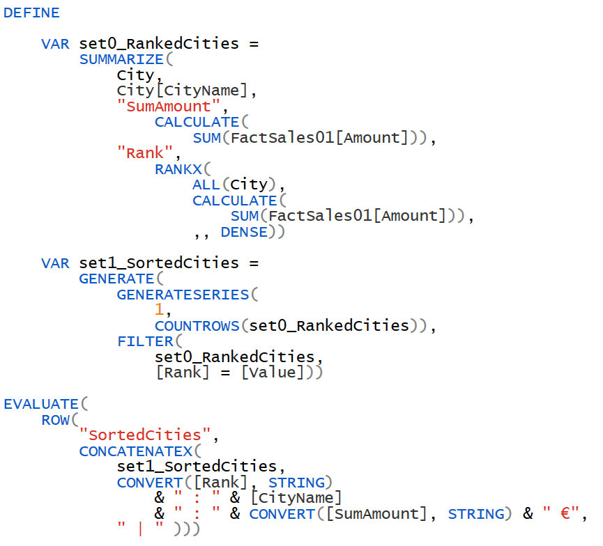 In der DAX-Sprache kann Sortierung erst am Schluss - bei der Ausgabe der Daten - angewandt werden, nicht jedoch zwischendurch, um beispielsweise Ergebnisse von Teil-Operationen als sortierte Menge in Variablen abzulegen. Der folgende Artikel zeigt, wie dieses Ziel mit der Hilfe von GENERATE und GENERATESERIES erreicht werden kann.