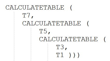 - CALCULATETABLE ( T3, CALCULATETABLE ( T2, T1 ) )