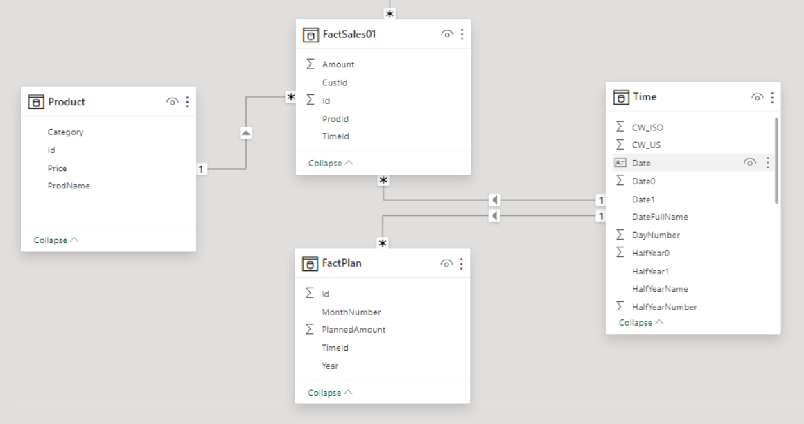 [Product] <- [FactSales01] -> [Time] <- [FactPlan]