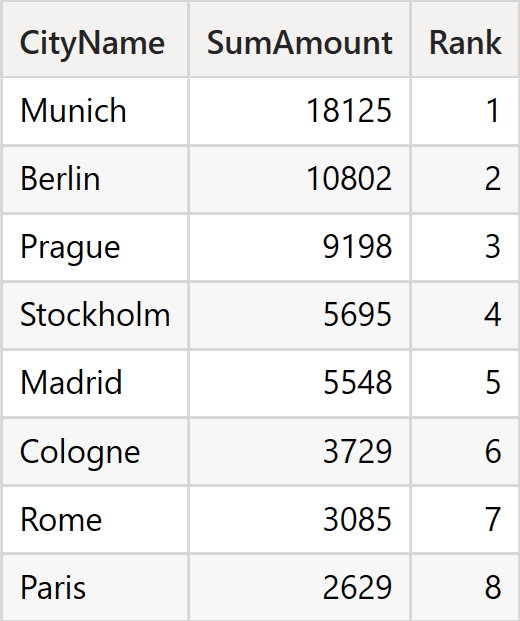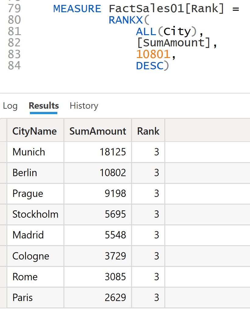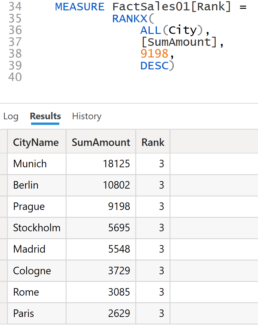 In the following, the measure definition is slightly changed and the constant value 9198 is used for argument 3. The array { 18125, 10802, 9198 ... } is created again as described above. Since the value 9198 is now found at index 2 for each city, the rank value 3 is mapped to each city.