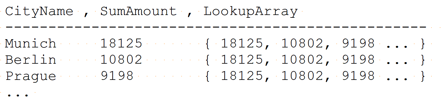 Step 5 - Assign the Lookup Array to each Row. The lookup array contains the same values that we can see in the grid: { 18125, 10802, 9198 ... }. Since the content of the array is constant and does not change during the outer iteration, optimizing the engine will probably ensure that the array is physically generated only once. Logically, however, the lookup array is generated for each row, since the generation is part of the measure expression: