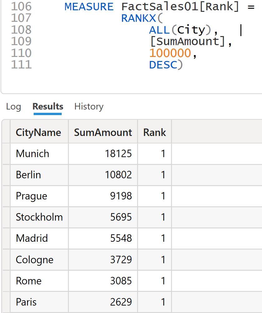 Step 2 - Building the Lookup Array. For each city, the [Rank] measure is called. RANKX first creates a list of all cities (= argument 1). If the table [City] were referenced without further modification, the filter of the outer context would come into play and the expression "City" would return only one row or only a single city. Therefore, RANKX uses "ALL(City)" to ensure that this filter is removed. Thus, the expression "ALL(City)" returns the complete table [City], where there is a single row per city. Alternatively, you could also work with ALLSELECTED at this point to simulate the effect of a slicer on the table [City]. This additional task is omitted here, as it has already been solved in many internet articles.