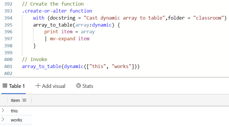 At the time i wrote this article there was no built-in function like array_to_table. But it is possible to implement your own conversion with the tools that the KQL language provides. There are three ways that this article is going to show: 1. a conversion only for the currently given array, 2. a dynamic conversion where an dynamic array is passed to a lambda expression and 3. a stored function named array_to_table that makes your conversion reusable.