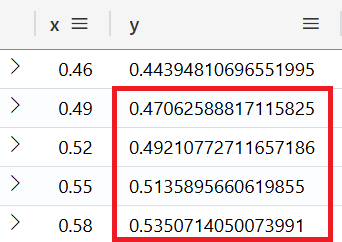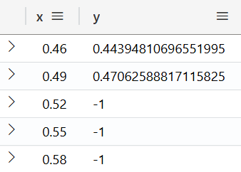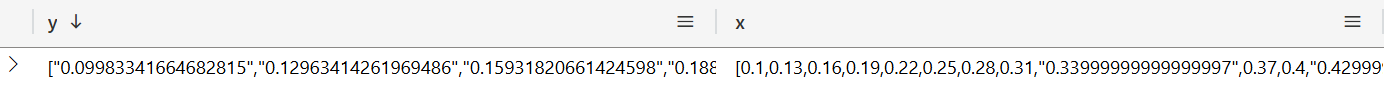 The screenshot above shows that the x-/y-axis tupel members reside separated from each other in two arrays. In order to extract a list of tupels from the two arrays, both arrays must be crossed simultaneously. E.g. x[0] and y[0] form the tuple (0.1, 0.0998334). In Python a function named map is able to do this, in KQL a similiar function named mv-expand exists. In order to understand, how make-series is going to add new items, the next code block presents the content of both arrays as a 2-column table. This separate step is dedicated to educational purpose only and is not part of the complete KQL code mentioned above. The array expansion would be superfluous because in the next step series-fill-linear requires the data in an array layout.