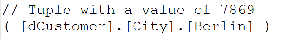 A complete tuple expression is used to uniquely refer to a single cube cell and its value. The [Measures] dimension is discussed below. Example:
