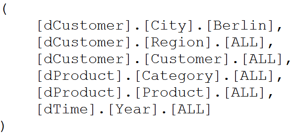 If the tuple expression does not make use of all dimensions or hierarchies that the cube provides, the tuple expression is treated as incomplete. Example:
