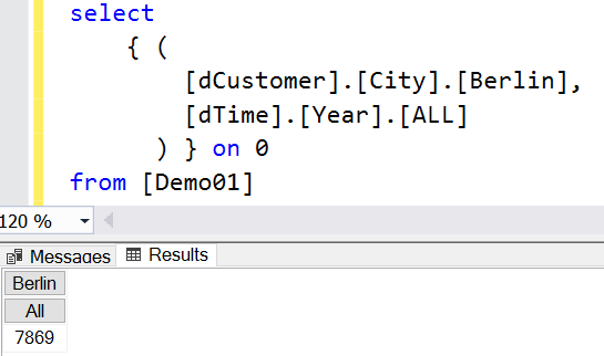 Here are two examples with the [Year].[ALL] member. Both tuple expressions return the same value. In the first example, the [Year].[ALL]-member is implicitly called by expansion. In the second example, the [Year].[ALL]-member explicitly called. The engine returns the same cell value because the schema has not yet been modified.