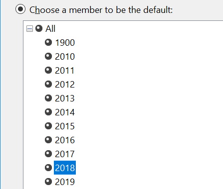 The default member [ALL] for the [Year]-hierarchy can be changed in SSDT to a specific member such as [2018]: