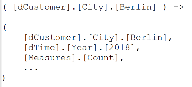 However, this is not entirely true. Expansion often - but not always - uses the [ALL] member. It depends on the context where the incomplete tuple is called. The context - in the sense of MDX - can be thought of as a complete set of members of all participating hierarchies representing the full dimensionality of the cube. Due to completeness, the context can be used in the case of missing hierarchy members, as it happens in the expansion process. The context is controlled by: